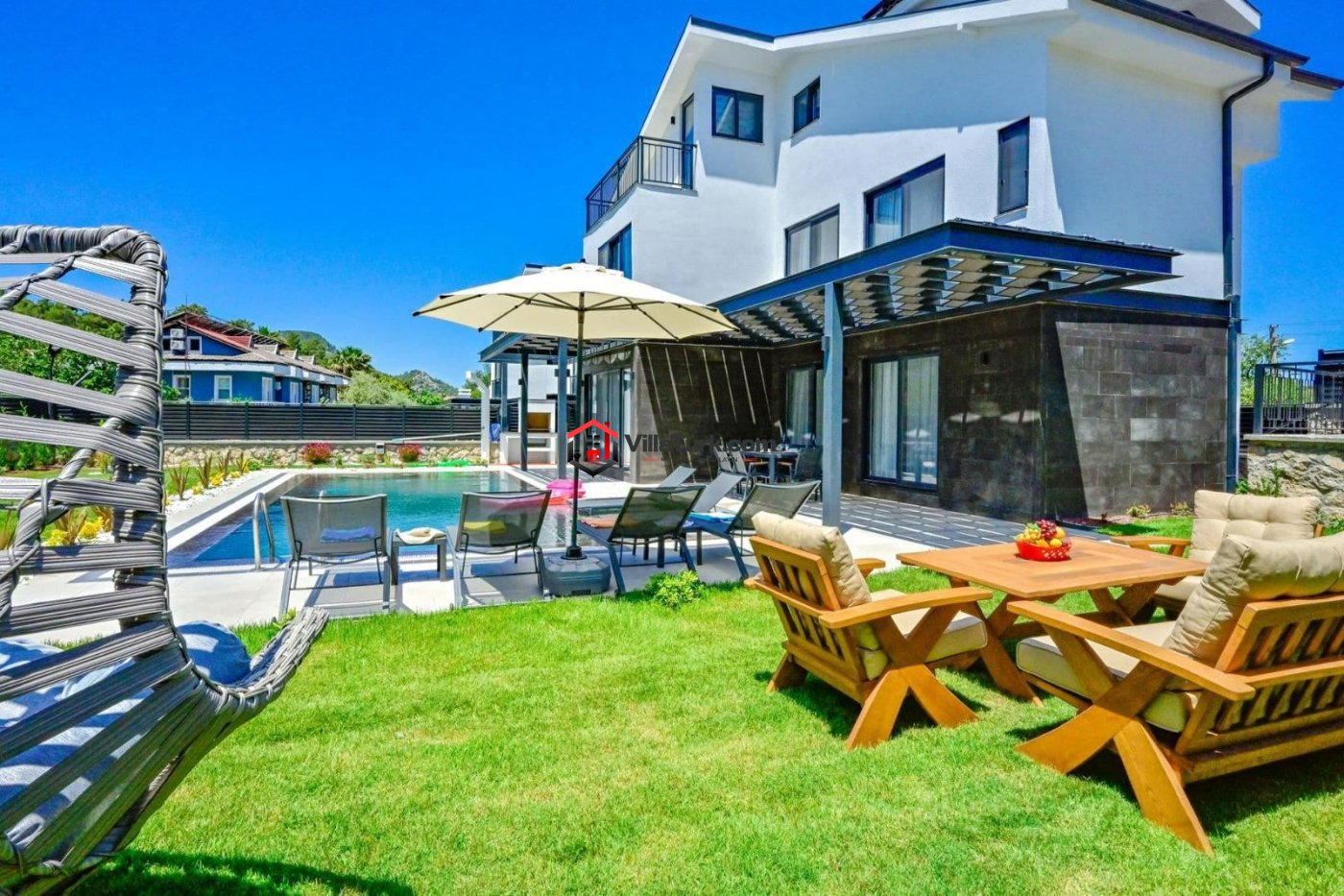 Doğayla İç İçe Bir Bahçe: Villanın yeşil bahçeli yapısı, doğayla olan bağınızı güçlendirirken; özel yüzme havuzu ise güneşin ve serinliğin tadını çıkarmanız için geniş bir alan sunar.