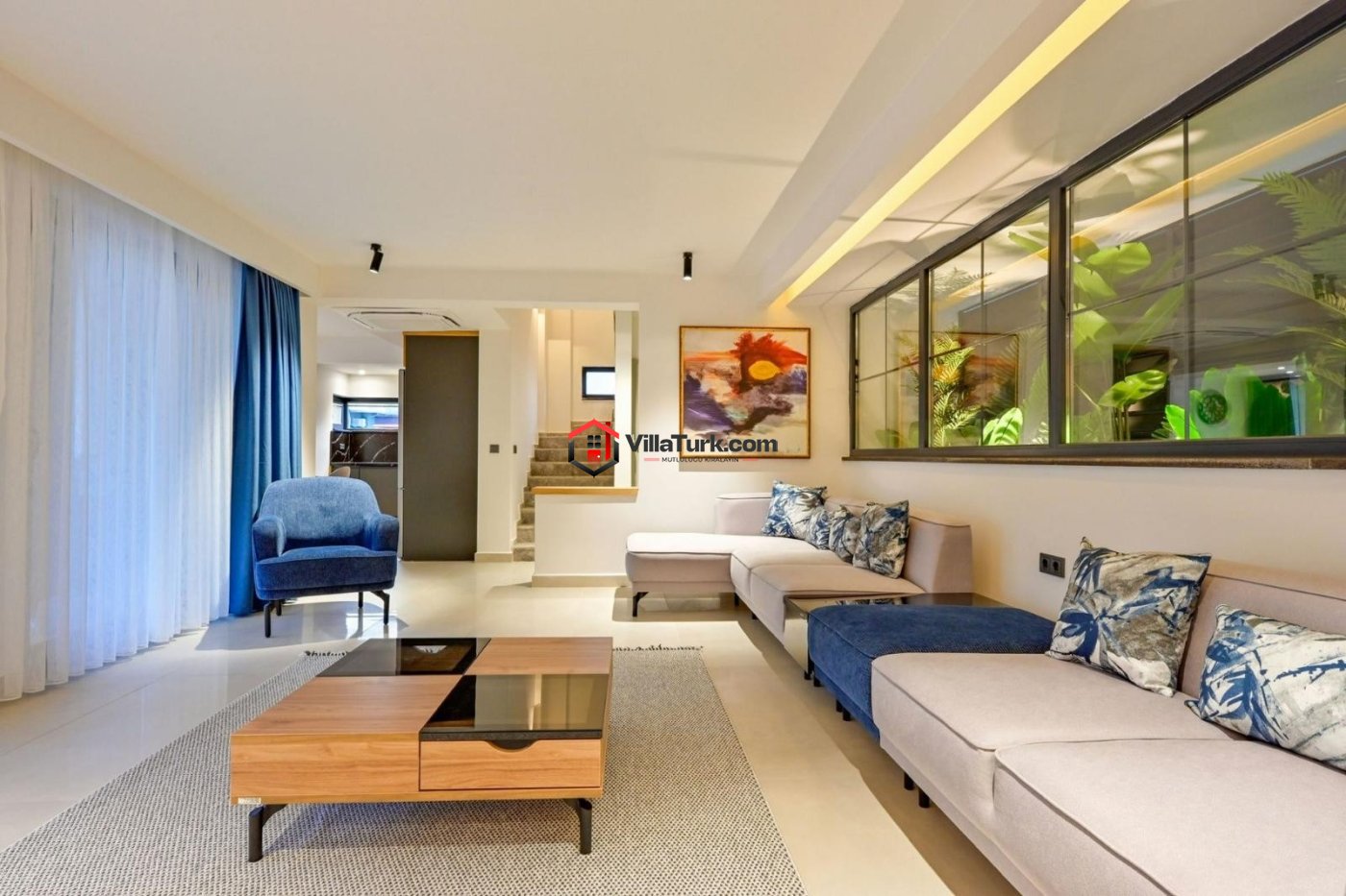 Villamızın iç mekânları, açık plan düzeni sayesinde oturma ve yemek alanlarını uyum içinde birleştiriyor. 8 kişilik yemek masası ve modern koltuklarla donatılan salon, tatilin sosyal kalbi olarak tasarlandı: