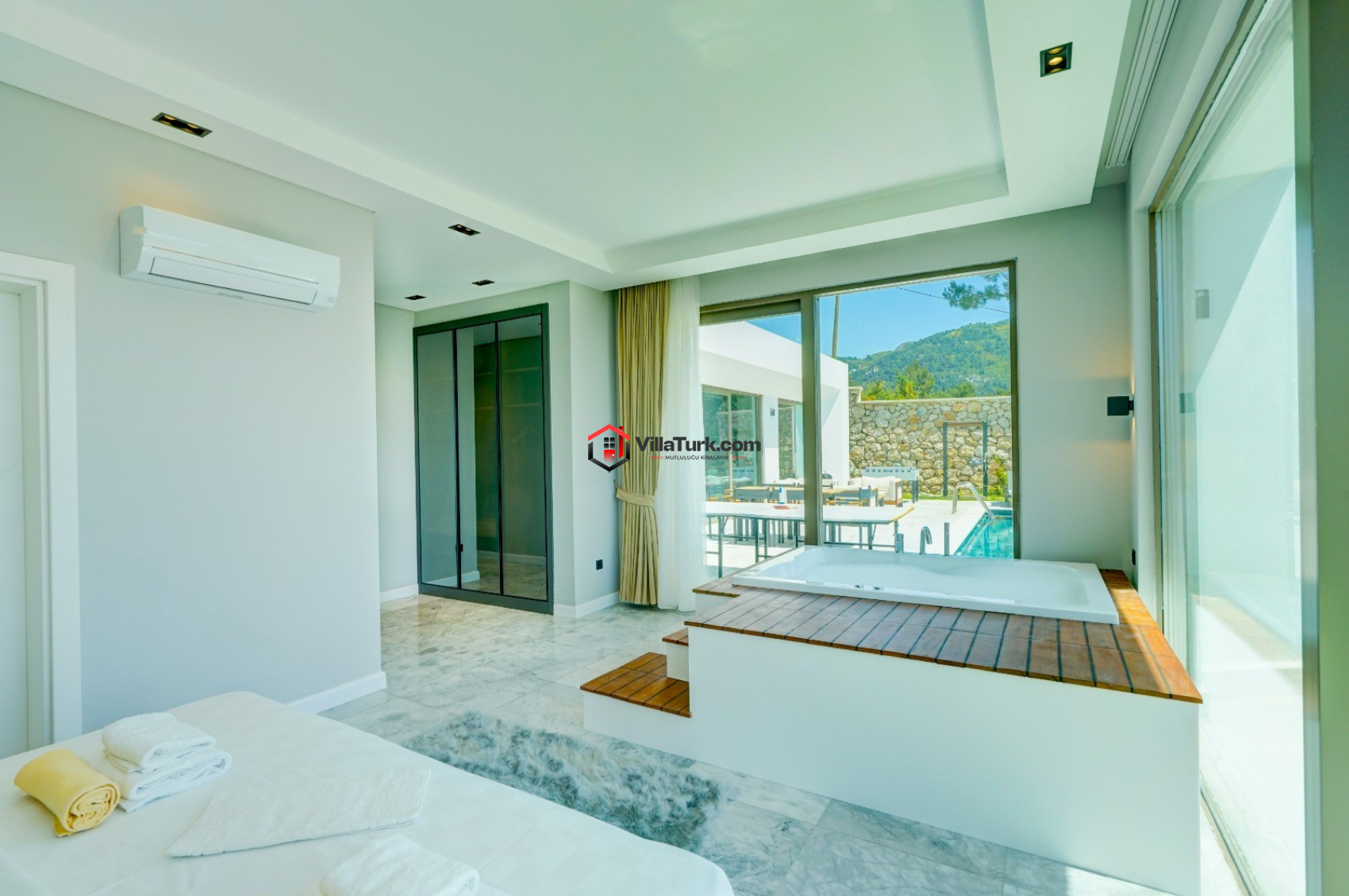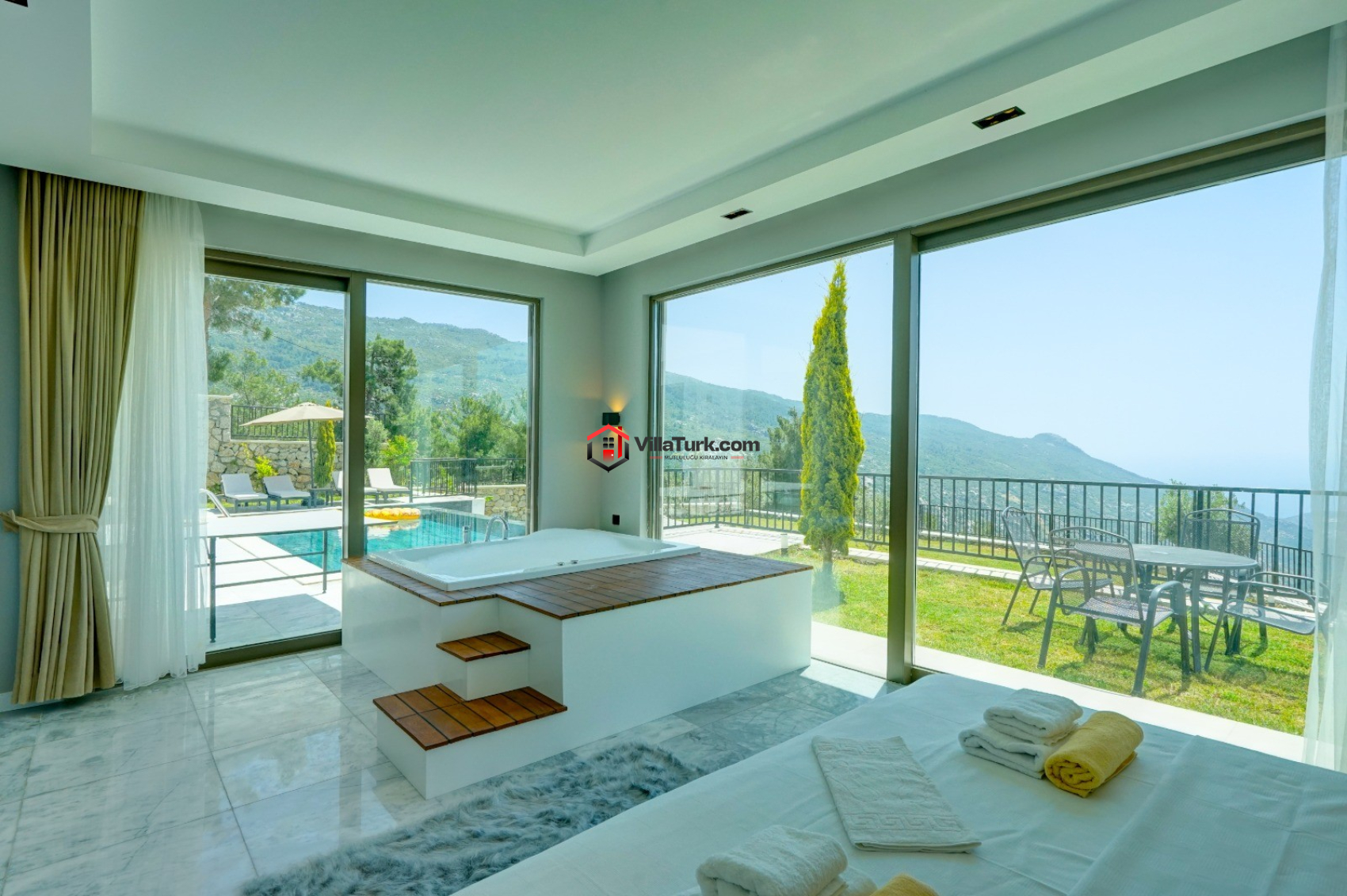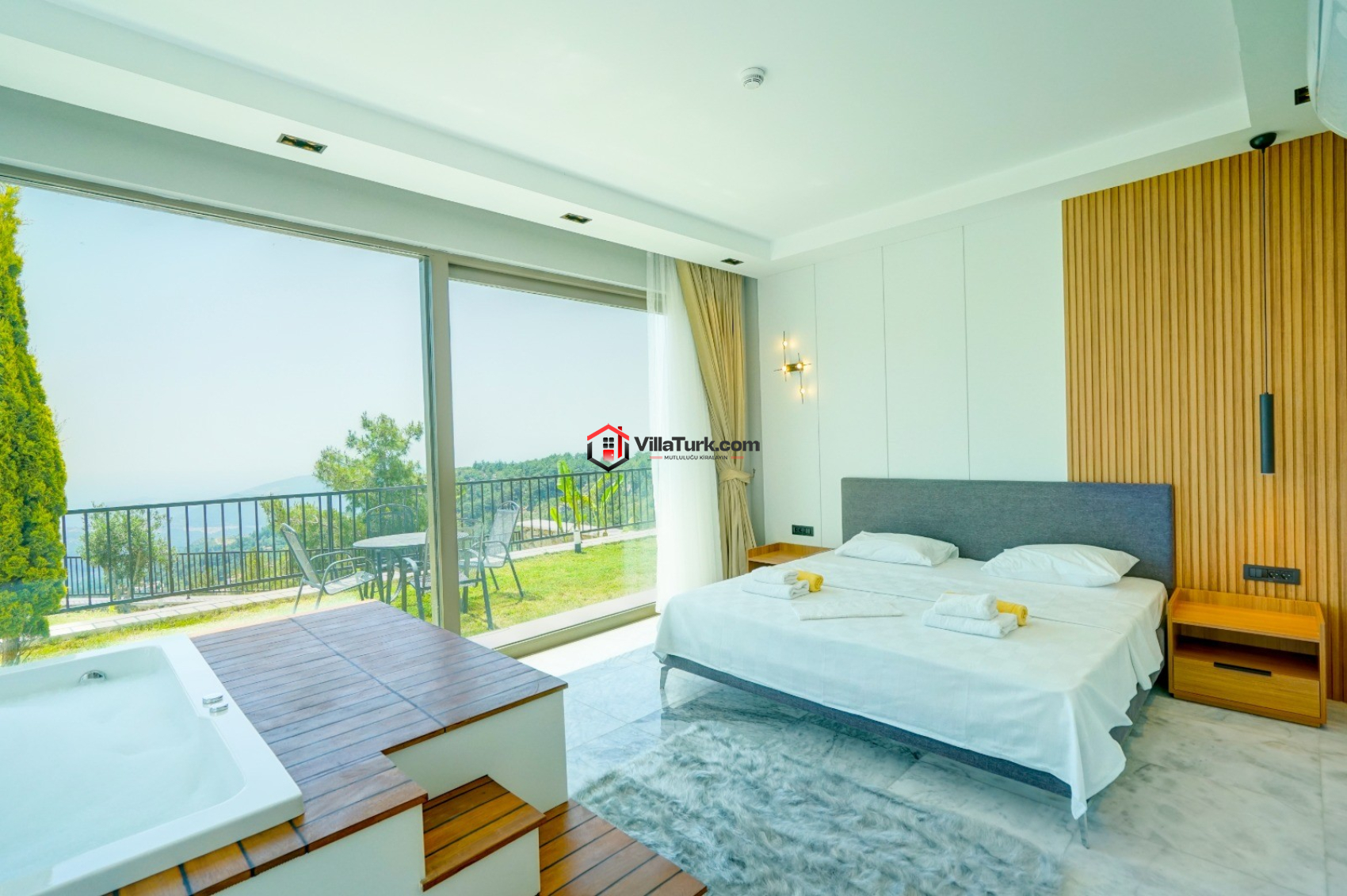 Earth 7, 3 yatak odası ve 6 kişilik konaklama kapasitesiyle hem geniş aileler hem de arkadaş grupları için ideal bir seçenek. Evin her alanı, konforlu bir tatil geçirmek için tasarlandı. Geniş ve ferah salon, LCD TV, uydu alıcısı ve klima gibi modern olanaklarla donatılmış. Mutfak ise tam donanımlı olup, yemek hazırlığı için her şeyi sunuyor. Akşam yemeğini havuz başında, bahçede yer alan yemek masasında keyifle yiyebilirsiniz.
