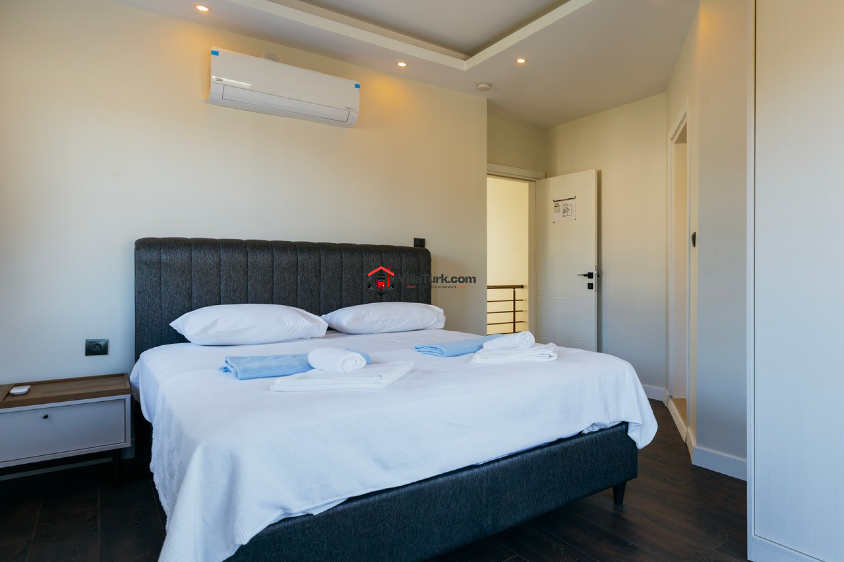 Yatak Odası: Çift kişilik yatak, klima ve dolap.