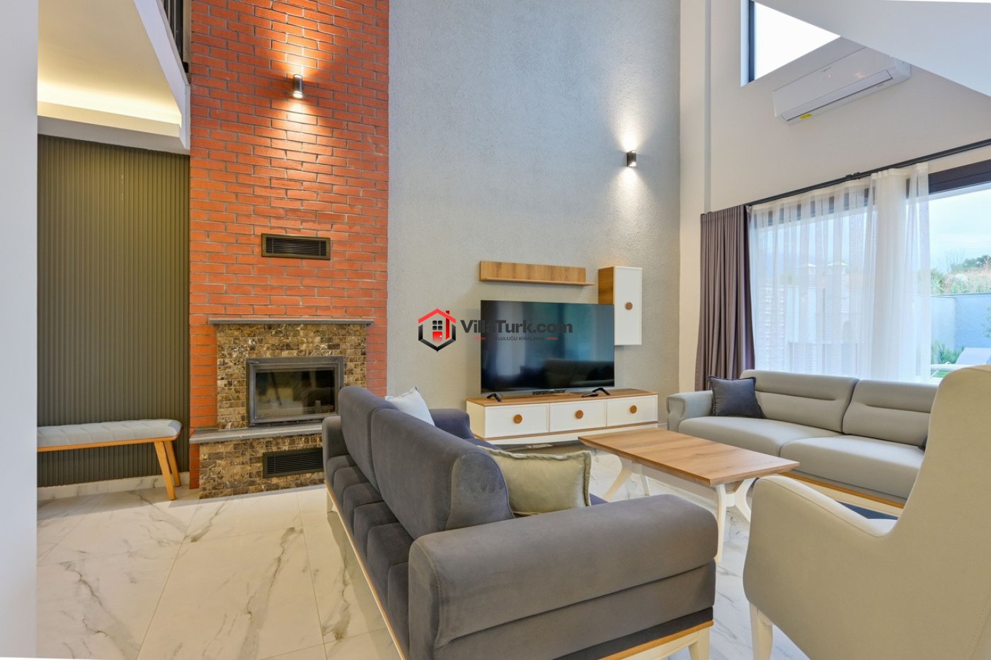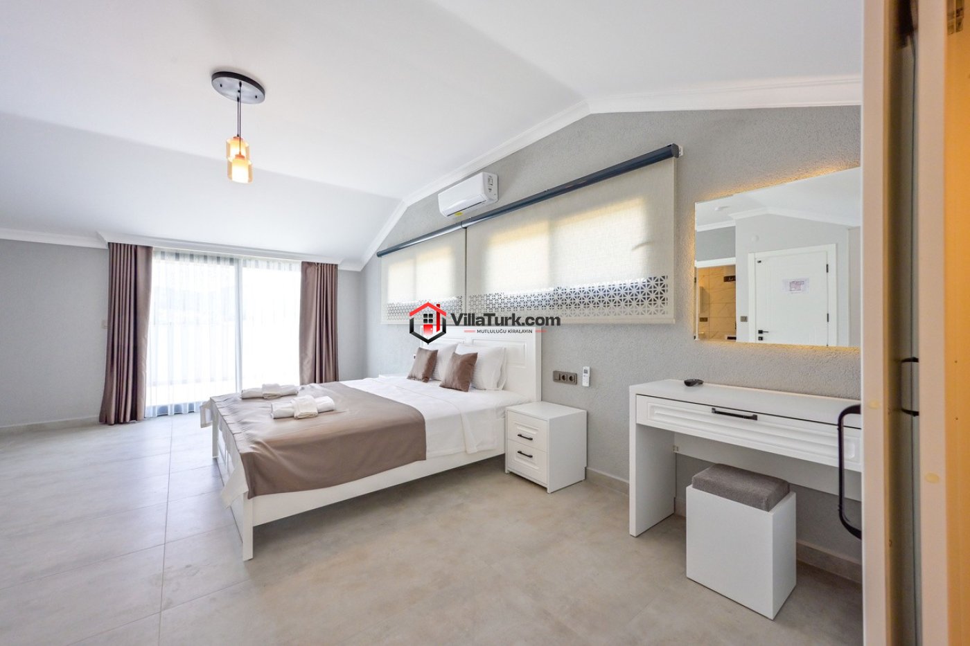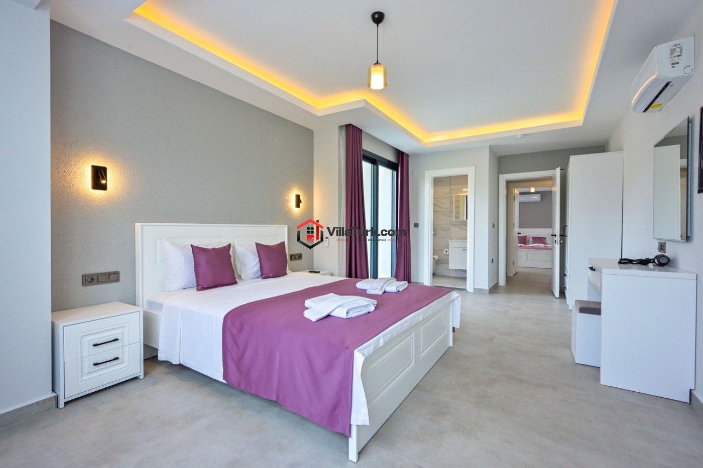 Villadaki tüm yatak odaları klima, TV, elbiselik, makyaj masası ve özel banyo/WC ile donatılmıştır: