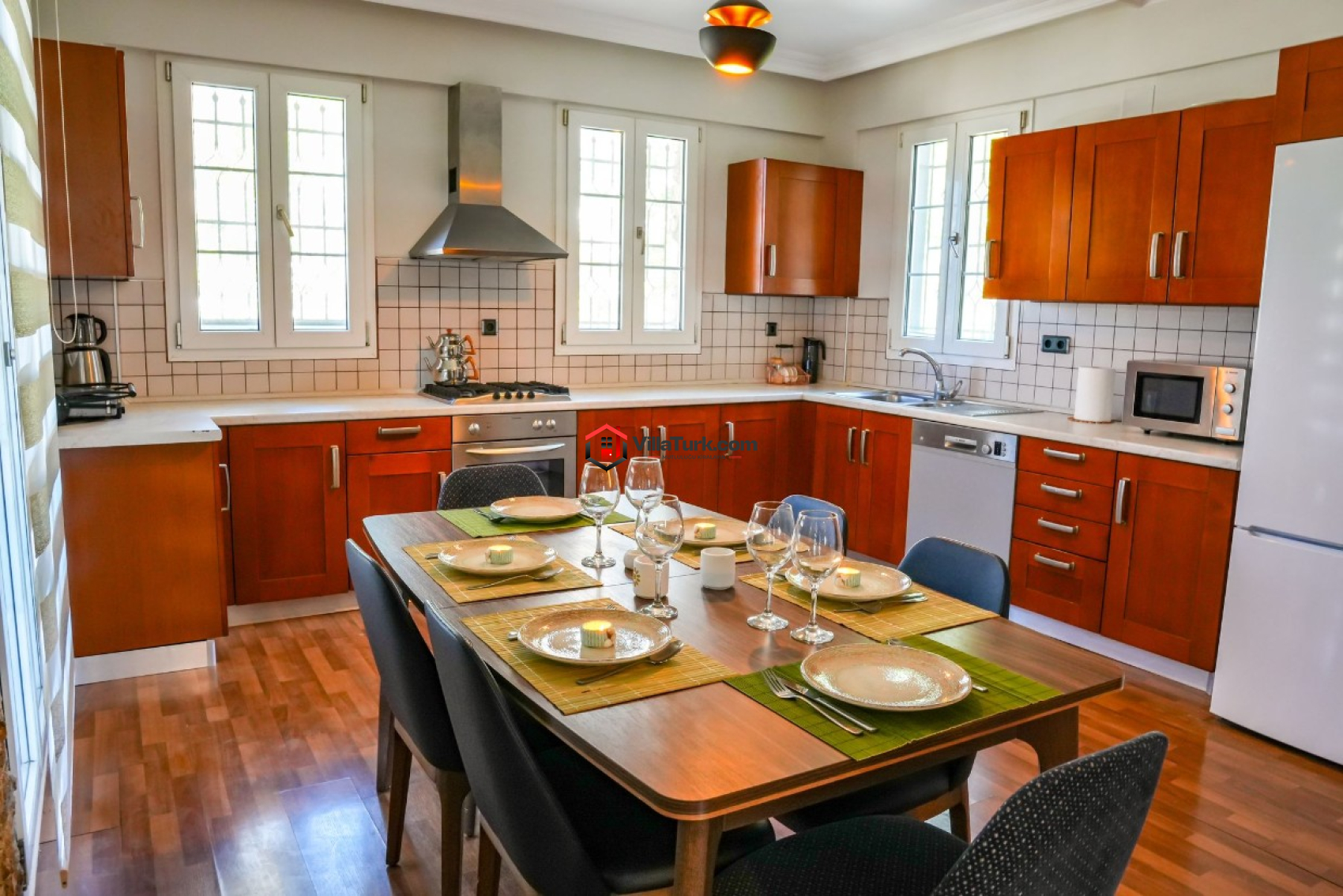 Tam donanımlı Amerikan mutfak; buzdolabı, bulaşık makinesi, çamaşır makinesi, 4’lü ocak, fırın, mikrodalga, kettle ve tost makinesi gibi tüm ihtiyaçları karşılayacak şekilde donatıldı.