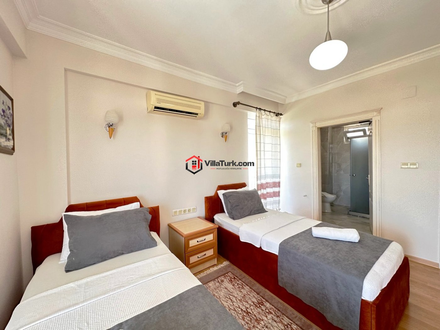 Üç katlı yapısıyla Villa Daphne 2, kalabalık konaklamalarda fonksiyonelliği ön planda tutuyor. Zemin kattaki havuz terasına doğrudan açılan aydınlık salon ve tam donanımlı mutfak, grubun bir arada vakit geçirmesi için ideal. Üst katlarda yer alan suit odalar ise kendi balkonları ve banyolarıyla size tam bir mahremiyet alanı sağlıyor. Özel havuzlu yazlıklar arasında sunduğu bu kapsamlı oda düzeniyle Daphne 2, her misafirine ayrıcalıklı hissettiriyor.