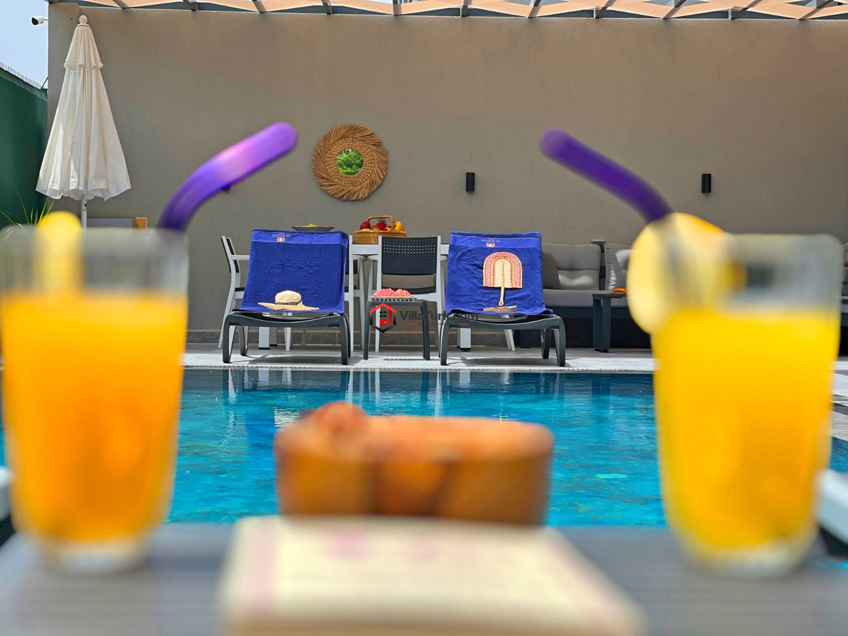 Villanın dış alanında ise özel yüzme havuzu, şezlonglar, güneş şemsiyesi ve bahçe tarzı oturma grubu yer alıyor. Geniş bahçesinde masa tenisi ve mangal keyfi de yapabilirsiniz. Özel yüzme havuzunun boyutları 7,5 m x 3,5 m olup derinliği 1.65 cm'dir, bu da tatilde serinlemek için mükemmel bir olanak sunar.