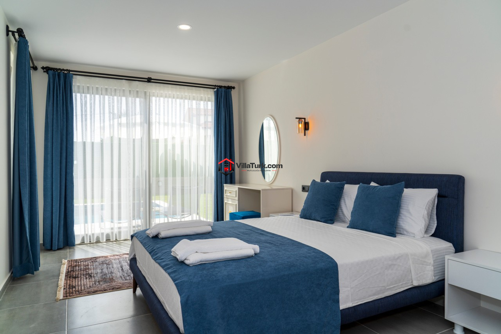 1. Yatak Odası: Çift kişilik yatak, elbise dolabı, klima, komodin, makyaj masası ve özel banyo/WC ile konforlu bir alan.