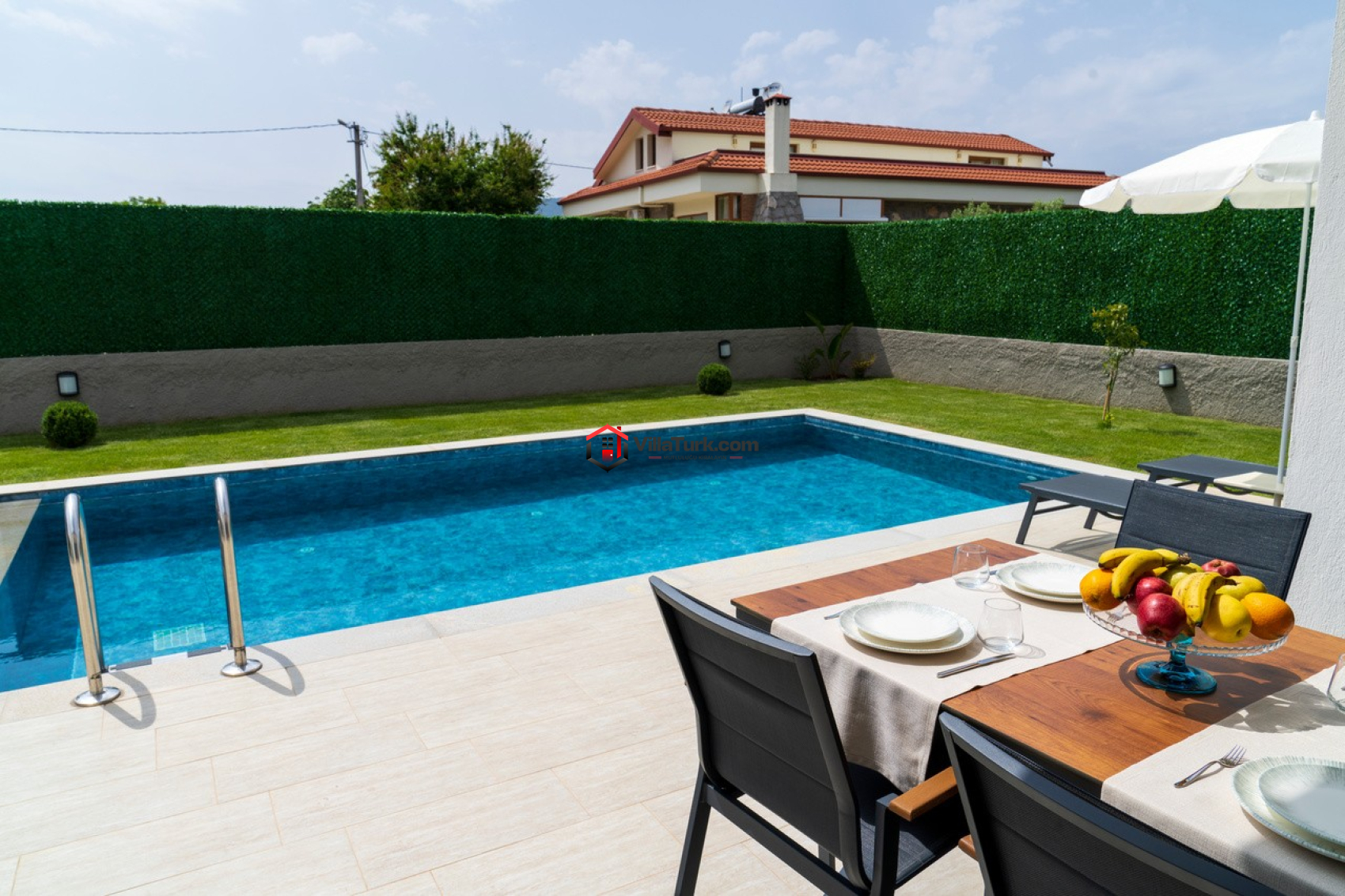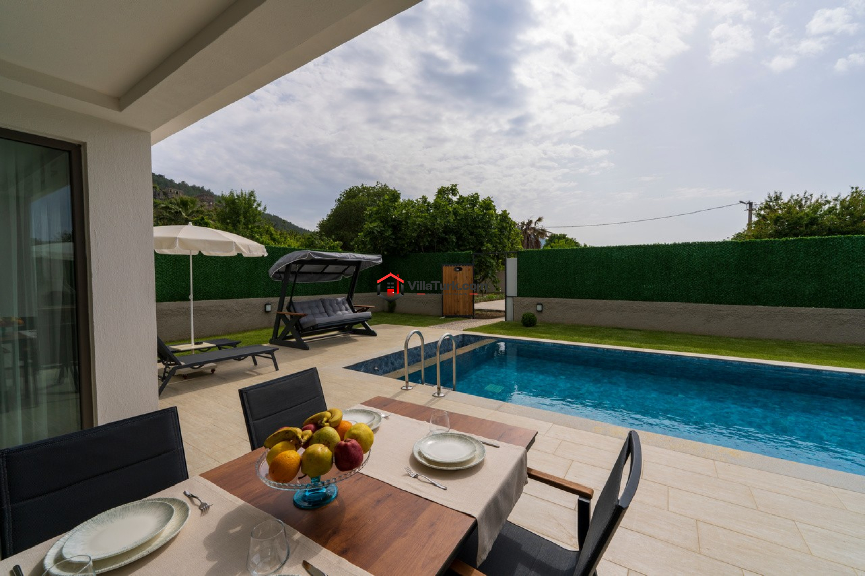Özel yüzme havuzu (8 m x 4 m, derinlik 1.50 m), şezlonglar, güneş şemsiyesi, yemek masası ve sandalyeler, salıncak ve barbekü ile çevrili bahçe, doğayla iç içe keyifli anlar sunuyor. Havuzun korunaklı yapısı, mahremiyet arayanlar için ideal.