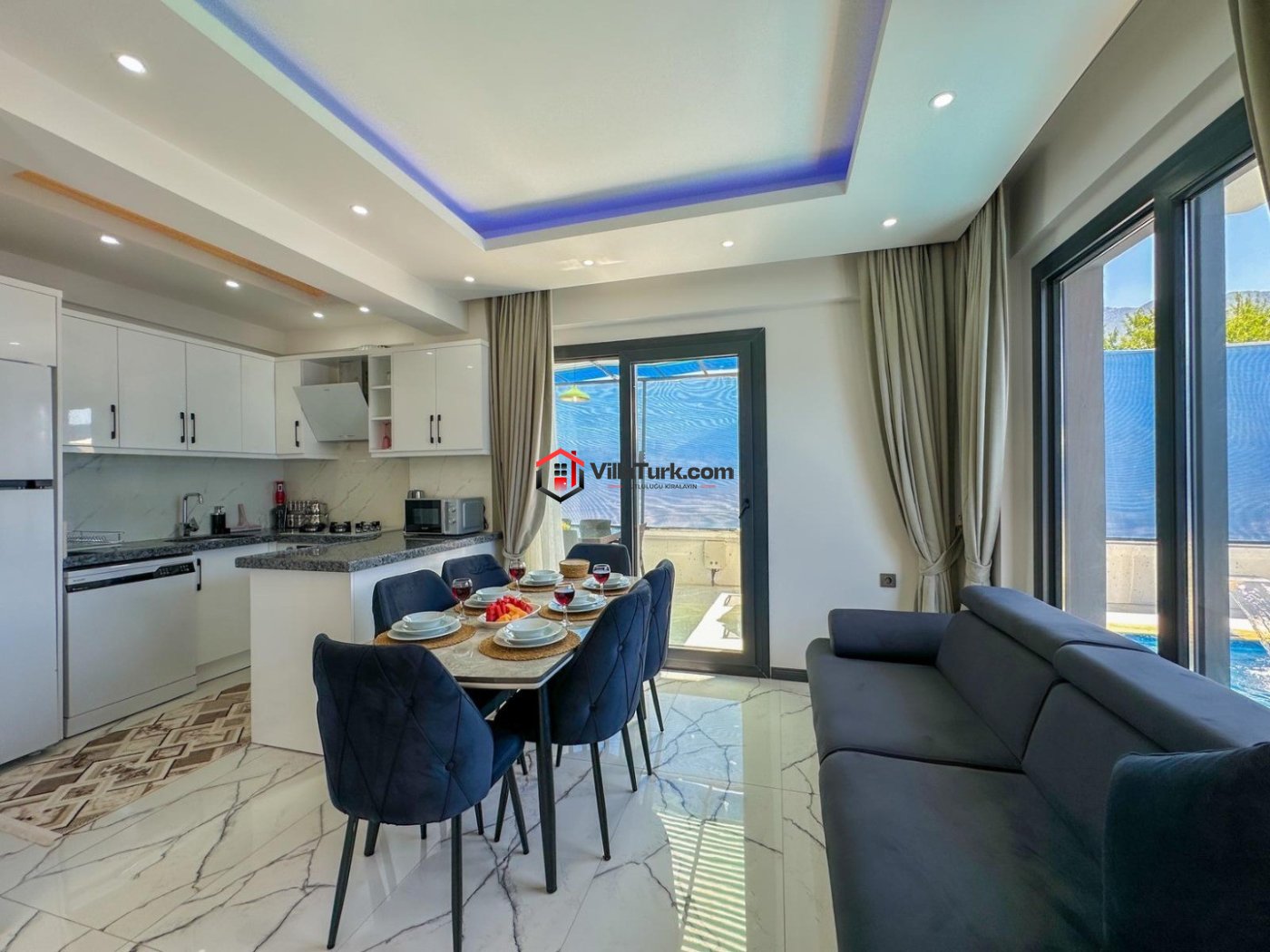 Havuz terasından doğrudan geçiş sağlanan geniş ve aydınlık oturma odası, modern ve konforlu detaylarla dekore edilmiştir. Burada rahat koltuklarda dinlenebilir, televizyon keyfi yapabilir veya sevdiklerinizle kaliteli zaman geçirebilirsiniz. Oturma odasıyla bütünleşen tam donanımlı açık mutfak, tatiliniz boyunca ihtiyaç duyabileceğiniz tüm mutfak ekipmanlarını eksiksiz bir şekilde sunar. Kendi yemeklerinizi hazırlama özgürlüğüyle, sevdiklerinizle birlikte lezzetli sofralar kurmanın tadını çıkarın.
