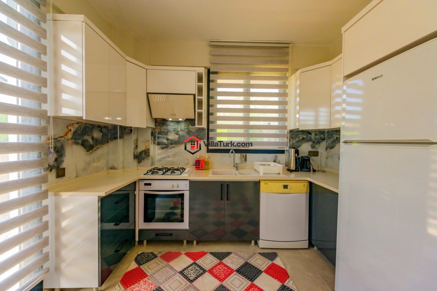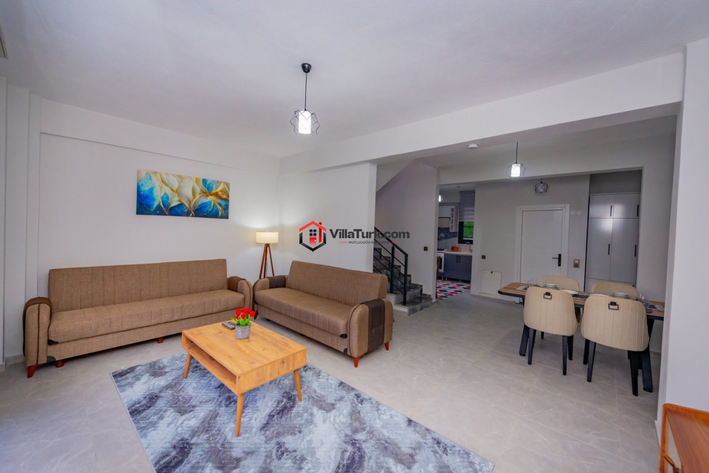 Villa iç mekanındaki düzen ve detaylar, misafirlerin rahatlığı düşünülerek özenle tasarlanmıştır. Oturma odası, dinlenmeniz için sıcak ve rahat bir atmosfer sunarken, donanımlı mutfak alanı ise kendi yemeklerinizi hazırlama özgürlüğü sağlamaktadır.