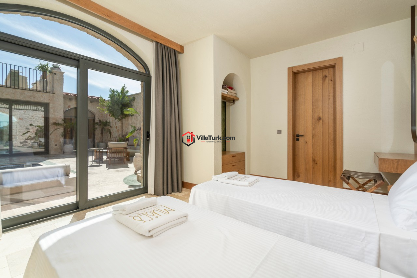 Villa Thalia’da dört adet çift kişilik yataklı oda ebeveyn banyoları ile donatılmışken, beşinci oda ise iki tek kişilik yatağıyla rahat bir alternatif sunuyor. Doğayla uyumlu renk paleti, rustik detaylarla buluşarak sofistike bir atmosfer yaratıyor.